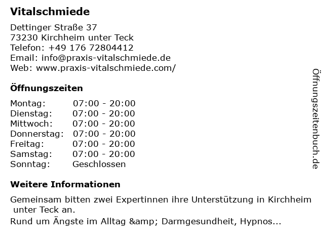 | Öffnungszeiten Vitalschmiede in Kirchheim unter Teck anzeigen | |