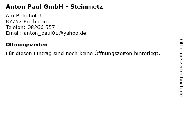 | Telefonnummer Anton Paul GmbH - Steinmetz in Kirchheim (08266 557) anrufen | |