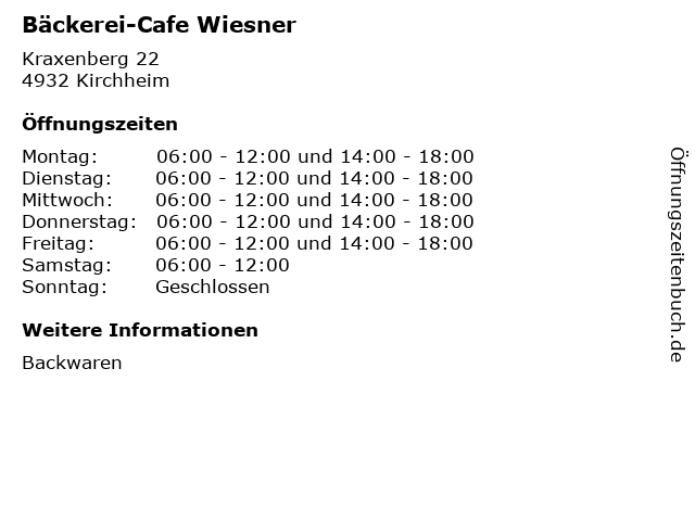 | Öffnungszeiten Bäckerei-Cafe Wiesner in Kirchheim anzeigen | |