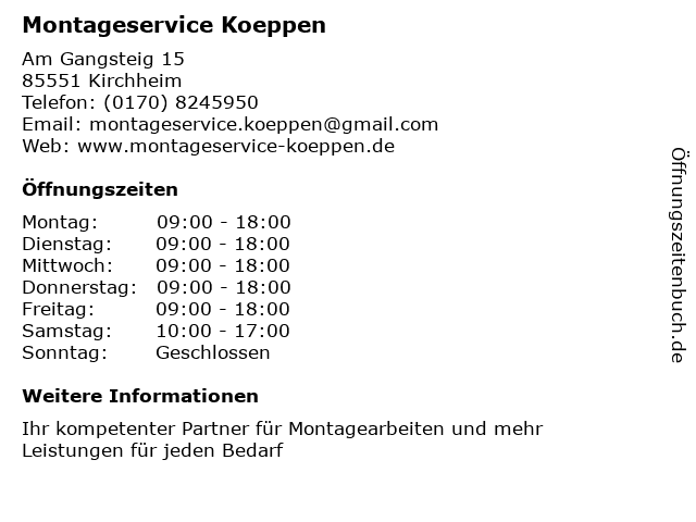 | Öffnungszeiten Montageservice Koeppen in Kirchheim anzeigen | |