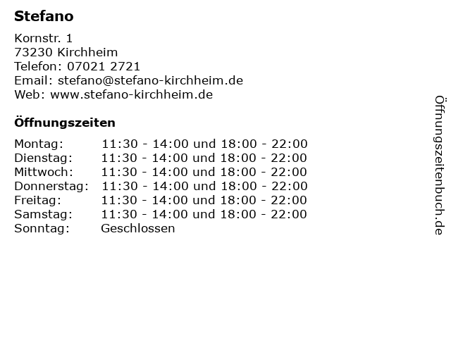 | Öffnungszeiten Stefano in Kirchheim anzeigen | |