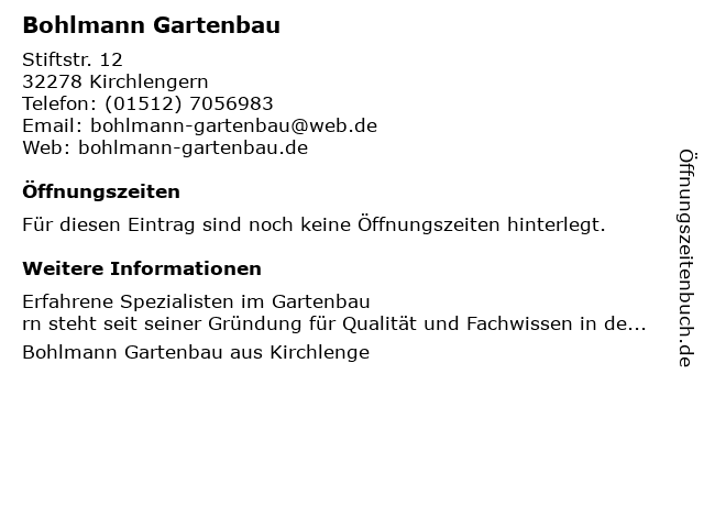 | Öffnungszeiten Bohlmann Gartenbau in Kirchlengern anzeigen | |