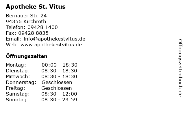 | Öffnungszeiten Apotheke St. Vitus in Kirchroth anzeigen | |