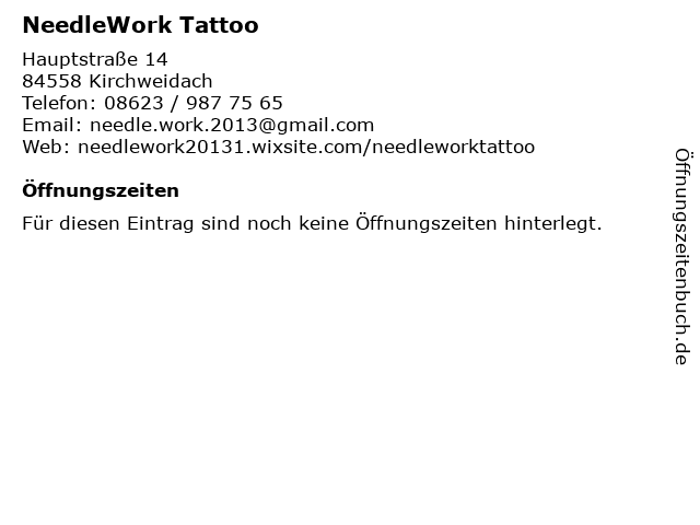 | Öffnungszeiten NeedleWork Tattoo in Kirchweidach anzeigen | |