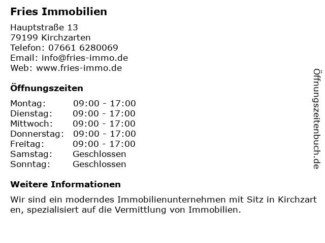 | Öffnungszeiten Fries Immobilien in Kirchzarten anzeigen | |