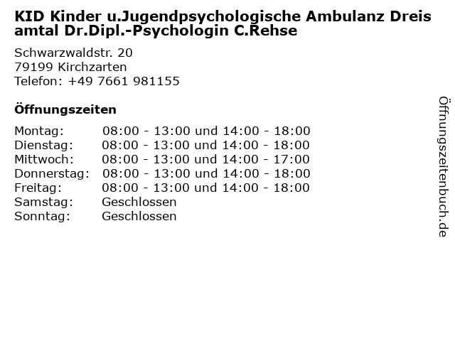 Branchen & Suchbegriffe zu KID Kinder u.Jugendpsychologische Ambulanz Dreisamtal Dr.Dipl.-Psychologin C.Rehse:ambulanz, c.rehse, dr.dipl., dreisamtal, kid, kinder, psychologe, psychologin, u.jugendpsychologische |