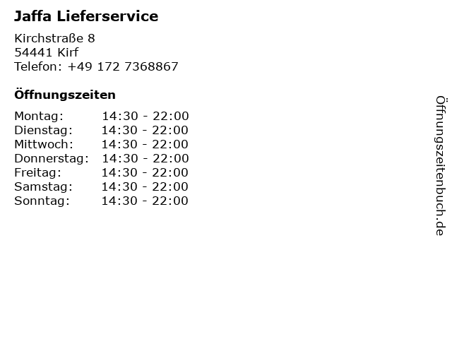 | Öffnungszeiten Jaffa Lieferservice in Kirf anzeigen | |
