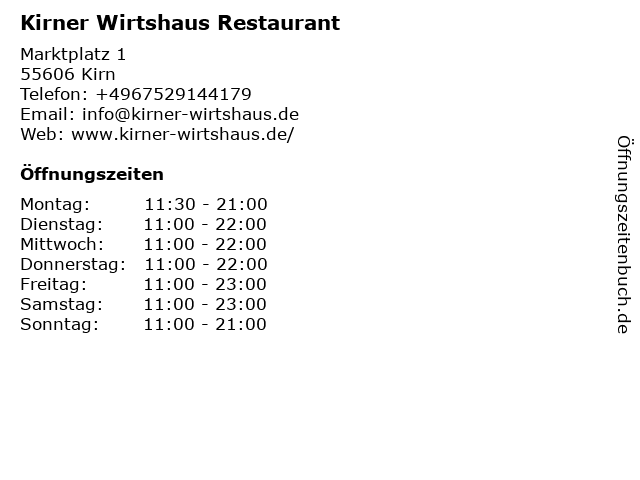 | Öffnungszeiten Kirner Wirtshaus Restaurant in Kirn anzeigen | |