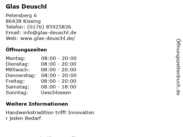 | Öffnungszeiten Glas Deuschl in Kissing anzeigen | |