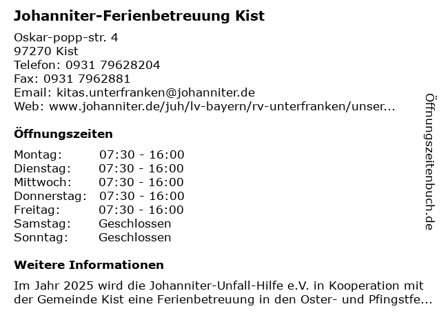 | Öffnungszeiten Johanniter-Ferienbetreuung Kist in Kist anzeigen | |