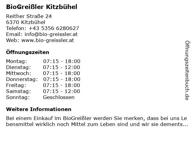 | Öffnungszeiten BioGreißler Kitzbühel in Kitzbühel anzeigen | |