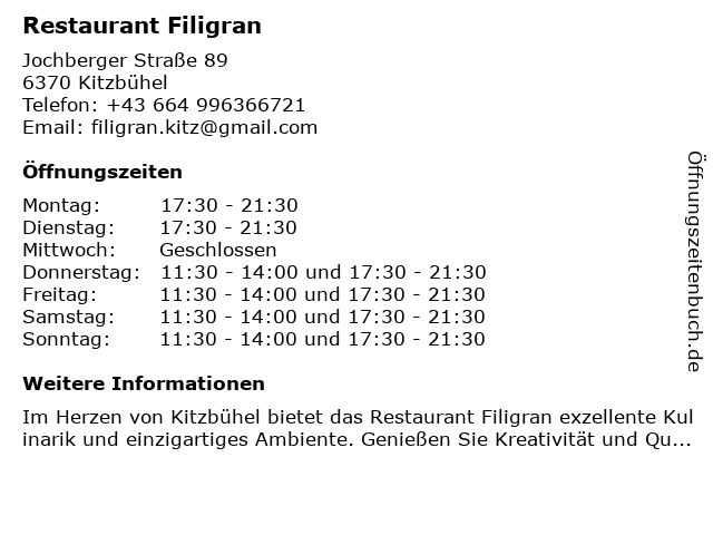| Öffnungszeiten Restaurant Filigran in Kitzbühel anzeigen | |