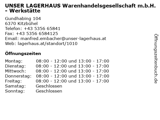 1 UNSER LAGERHAUS Warenhandelsgesellschaft m.b.H. - Agrar (Entfernung: 0,00 km) Gundhabing 104, 6370 Kitzbühel 3 Raiffeisen Lagerhaus Kitzbühel - Landmaschinen Handel (Entfernung: 0,00 km) Gundhabing 104, 6370 Kitzbühel 4 UNSER LAGERHAUS Warenhandelsgesellschaft m.b.H. - Baustoffe (Entfernung: 0,04 km) Gundhabing 104, 6370 Kitzbühel 6 Raiffeisen Immobilien Treuhand Kitzbüheler Alpen GmbH (Entfernung: 5,81 km) Bahnhofstraße 5a, 6372 Oberndorf |