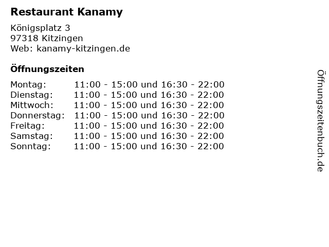 | Öffnungszeiten Restaurant Kanamy in Kitzingen anzeigen | |