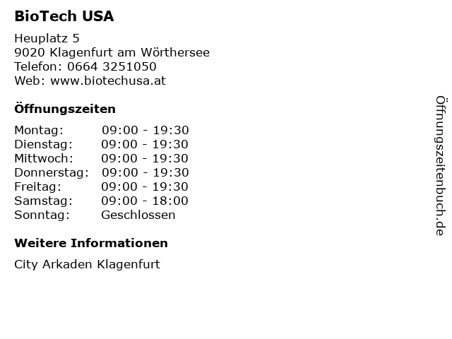 | Öffnungszeiten BioTech USA in Klagenfurt am Wörthersee anzeigen | |