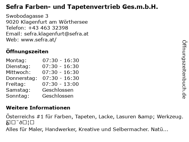 Branchen & Suchbegriffe zu Sefra Farben- und Tapetenvertrieb Ges.m.b.H.:beratung, dichtungsmassen, farben, fassadenfarben, ges.m.b.h., grundierungen, grundierungen wand, holzschutz, innenwandfarben, kleister, lacke, lasuren, lösemittel, parkettversiegelungslacke, sefra, spachtelmassen, tapete, tapetenvertrieb, thermosave, vliese |
