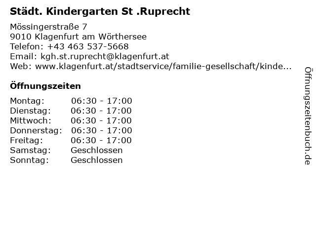 1 Städt. Kindergarten St. Ruprecht (Entfernung: 0,00 km) Mössingerstraße 7, 9020 Klagenfurt Am Wörthersee 2 Friedhof St. Ruprecht (Entfernung: 0,89 km) St. Ruprechter Strasse/Heizhausgasse 7, 9020 Klagenfurt am Wörthersee 3 Städt. Kindergarten und Hort Haus des Kindes (Entfernung: 1,73 km) Johann Strauß Gasse 10, 9010 Klagenfurt am Wörthersee 4 Städt. Kindergarten Annabichl (Entfernung: 1,73 km) Ehrentalerstraße 24, 9010 Klagenfurt am Wörthersee 6 Städt. Kindergarten Sonnenschein (Entfernung: 2,61 km) Lortzinggasse 29, 9010 Klagenfurt am Wörthersee |