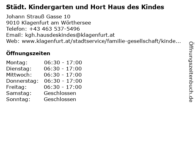 1 Kindergarten Haus des Kindes (Altersübergreifende Gruppe) (Entfernung: 0,01 km) Johann-Strauß-Gasse 10, 9020 Klagenfurt Am Wörthersee 2 Kindergarten Haus des Kindes - Ganztagsbetreuung (Entfernung: 0,01 km) Johann-Strauß-Gasse 10, 9020 Klagenfurt Am Wörthersee 3 Kindergarten Haus des Kindes - Halbtagsbetreuung (Entfernung: 0,01 km) Johann-Strauß-Gasse 10, 9020 Klagenfurt Am Wörthersee 5 BIFIE – Bundesinstitut für Bildungsforschung, Innovation & Entwicklung des österreichischen Schulwesens (Entfernung: 1,46 km) Kaufmanngasse 8, 9020 Klagenfurt 6 Gemeindeamt Maria Rain - Sprechstunden des Bürgermeisters (Entfernung: 6,23 km) Kirchenstraße 1, 9161 Maria Rain |