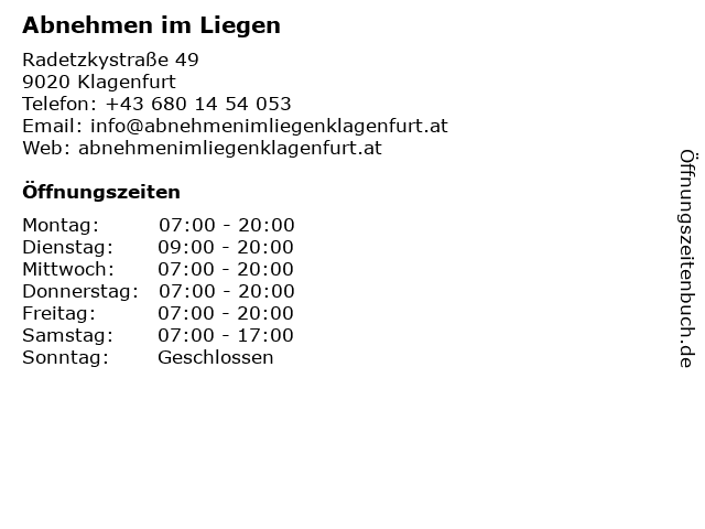 | Öffnungszeiten Abnehmen im Liegen in Klagenfurt anzeigen | |