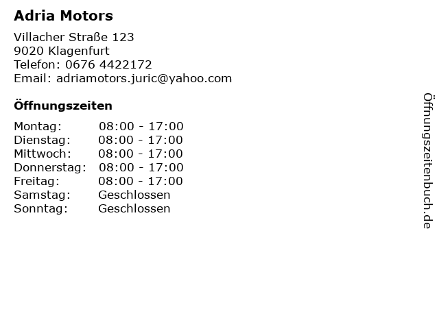 | Öffnungszeiten Adria Motors in Klagenfurt anzeigen | |