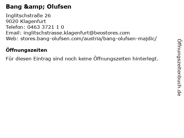 | Öffnungszeiten Bang & Olufsen in Klagenfurt anzeigen | |