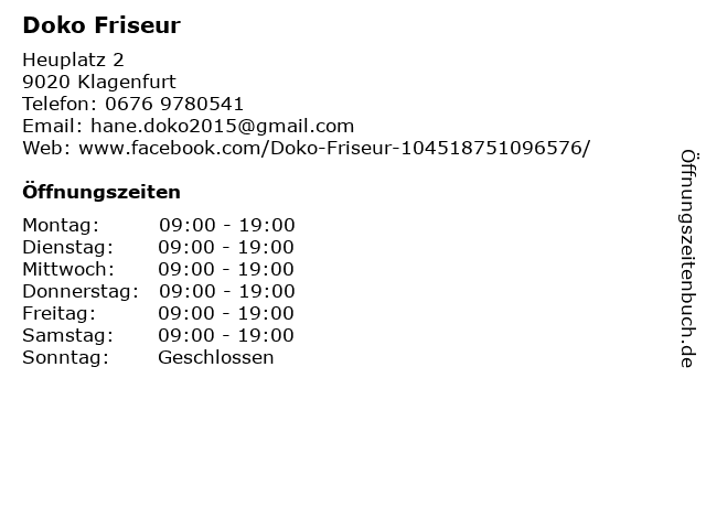 | Öffnungszeiten Doko Friseur in Klagenfurt anzeigen | |