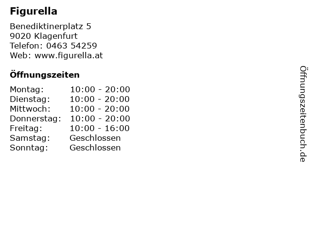 | Öffnungszeiten Figurella in Klagenfurt anzeigen | |