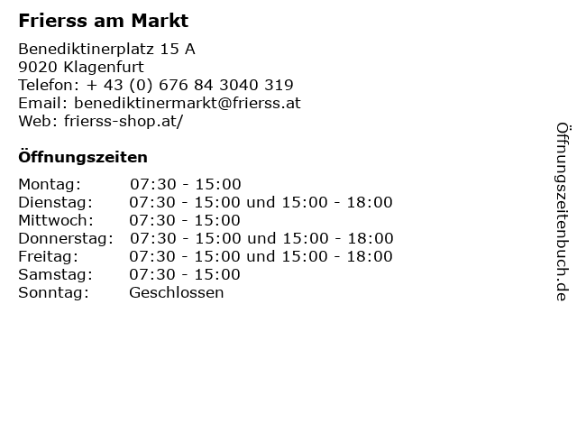 | Öffnungszeiten Frierss am Markt in Klagenfurt anzeigen | |