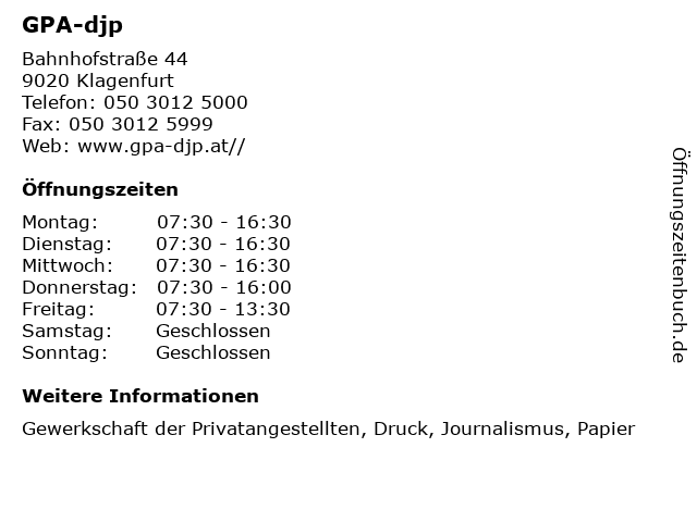 | Öffnungszeiten GPA-djp in Klagenfurt anzeigen | |