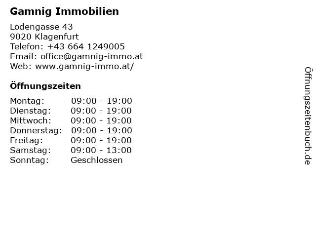 | Öffnungszeiten Gamnig Immobilien in Klagenfurt anzeigen | |