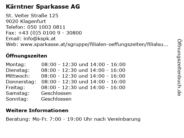 | Öffnungszeiten Kärntner Sparkasse AG in Klagenfurt anzeigen | |