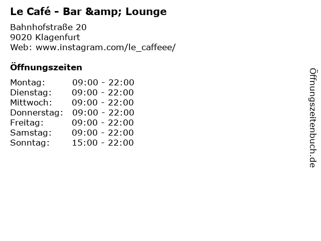| Öffnungszeiten Le Café - Bar & Lounge in Klagenfurt anzeigen | |