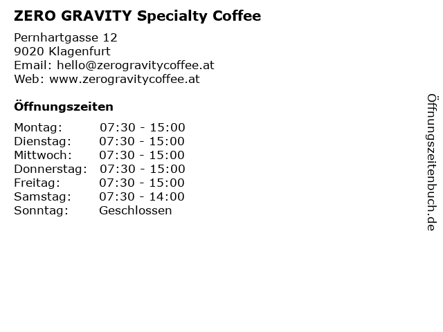 | Öffnungszeiten ZERO GRAVITY Specialty Coffee in Klagenfurt anzeigen | |