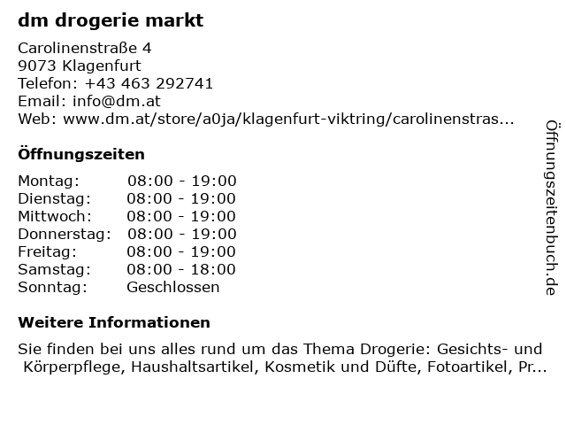 | Öffnungszeiten dm drogerie markt in Klagenfurt anzeigen | |