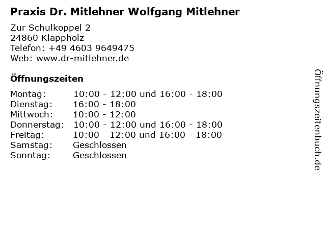 1 Dr. Wolfgang Mitlehner Praxis für Innere Medizin, Lungen- Bronchialheilkunde, Allergologie (Entfernung: 0,01 km) Zur Schulkoppel 2, 24860 Klappholz 6 |