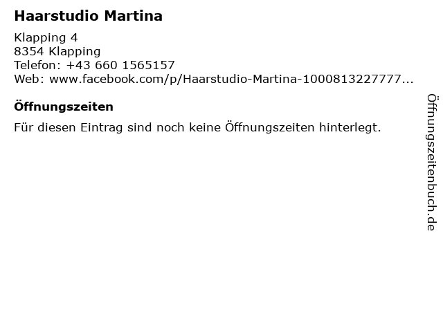 | Öffnungszeiten Haarstudio Martina in Klapping anzeigen | |
