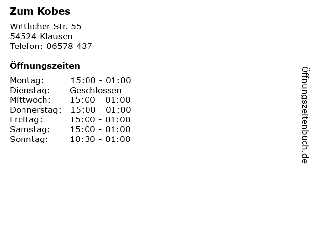 | Öffnungszeiten Zum Kobes in Klausen anzeigen | |