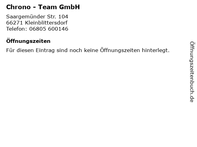 | Öffnungszeiten Chrono - Team GmbH in Kleinblittersdorf anzeigen | |