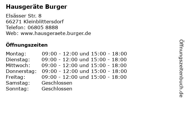 | Öffnungszeiten Hausgeräte Burger in Kleinblittersdorf anzeigen | |