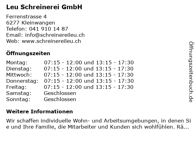 | Öffnungszeiten Leu Schreinerei GmbH in Kleinwangen anzeigen | |