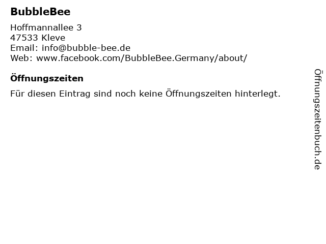 | Öffnungszeiten BubbleBee in Kleve anzeigen | |