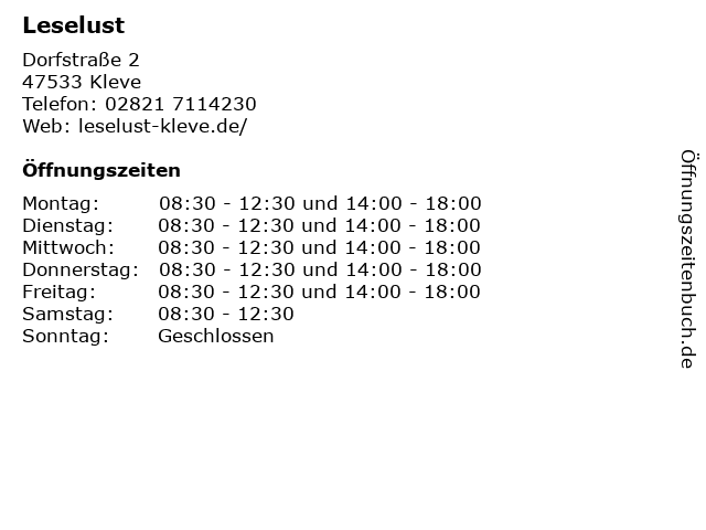 | Öffnungszeiten Leselust in Kleve anzeigen | |