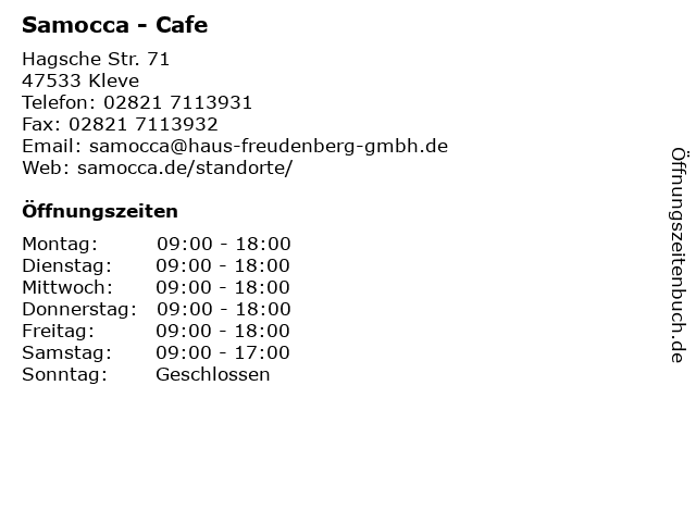 | Öffnungszeiten Samocca - Cafe in Kleve anzeigen | |