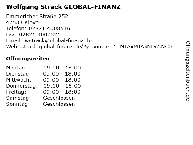 | Öffnungszeiten Wolfgang Strack GLOBAL-FINANZ in Kleve anzeigen | |