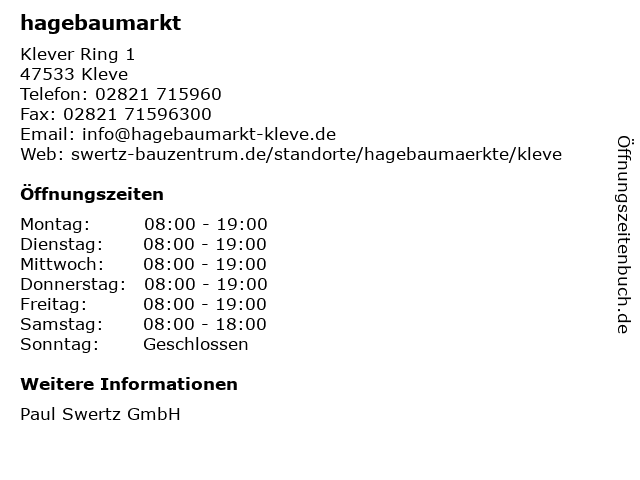 | Öffnungszeiten hagebaumarkt in Kleve anzeigen | |