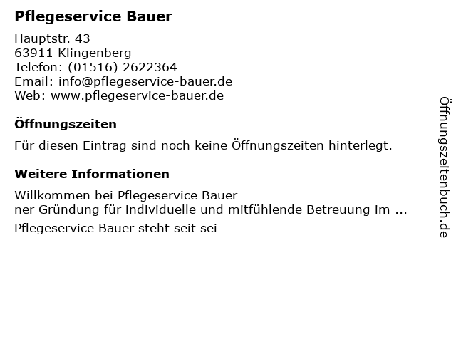 | Öffnungszeiten Pflegeservice Bauer in Klingenberg anzeigen | |