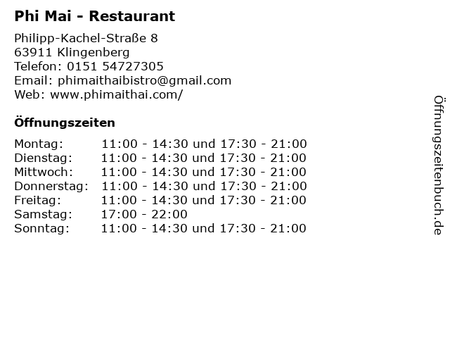 | Öffnungszeiten Phi Mai - Restaurant in Klingenberg anzeigen | |
