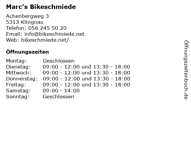 | Öffnungszeiten Marc's Bikeschmiede in Klingnau anzeigen | |
