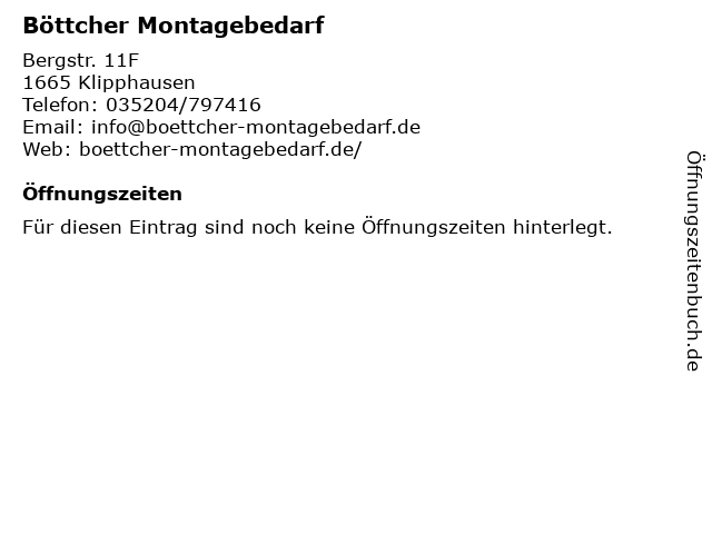 | Öffnungszeiten Böttcher Montagebedarf in Klipphausen anzeigen | |