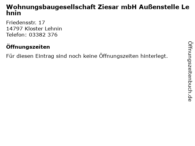 | Wohnungsbaugesellschaft Ziesar mbH Außenstelle Lehnin anrufen | |